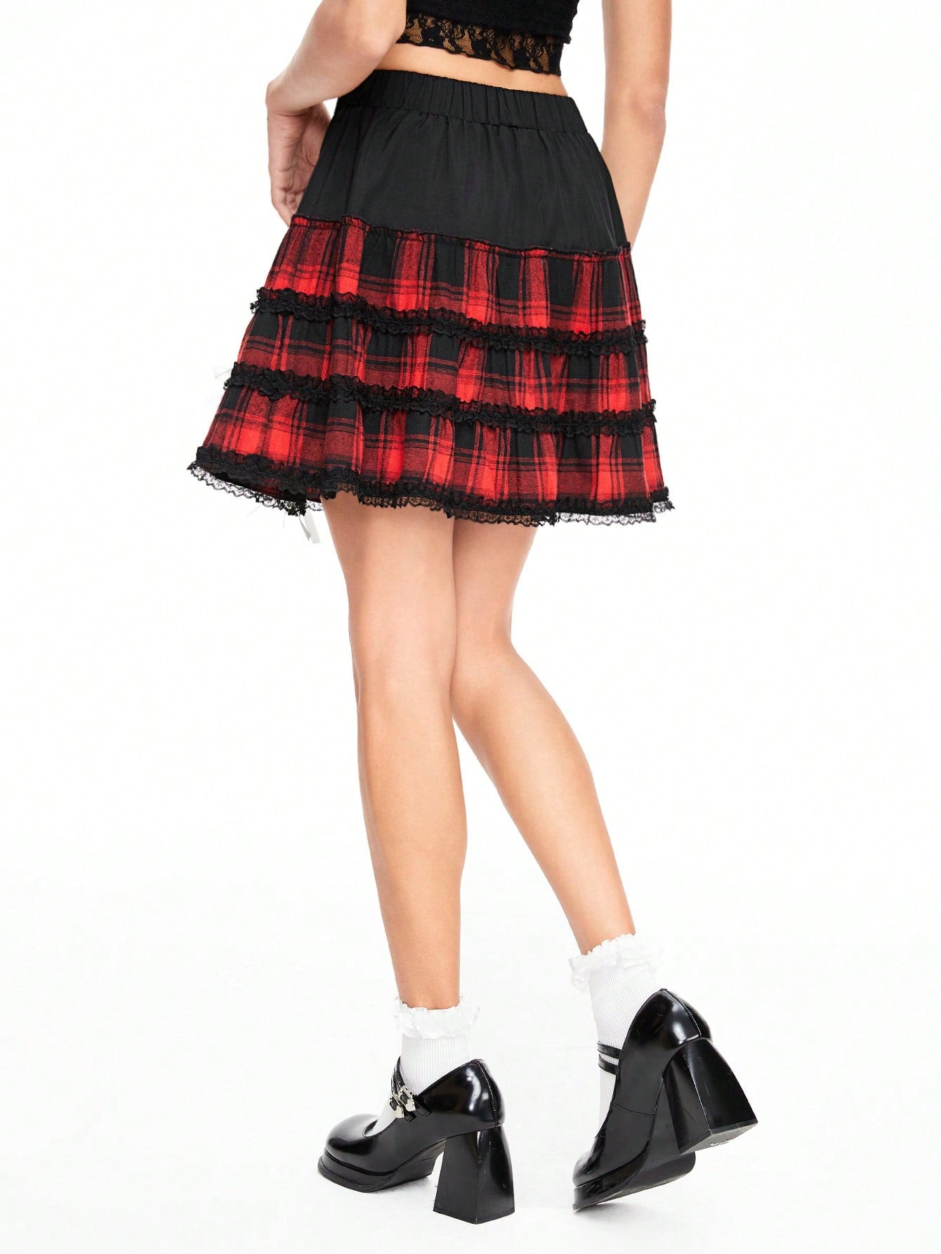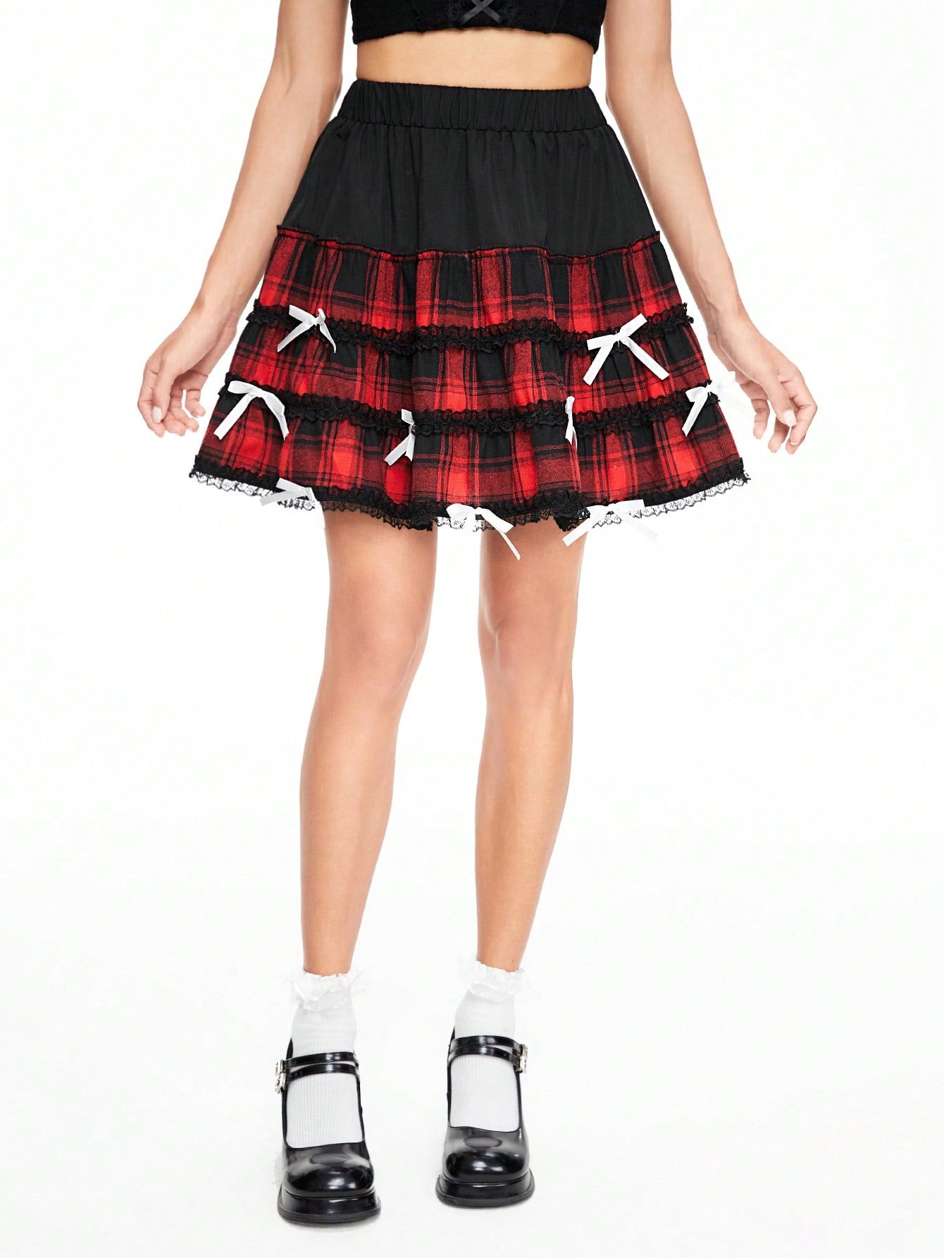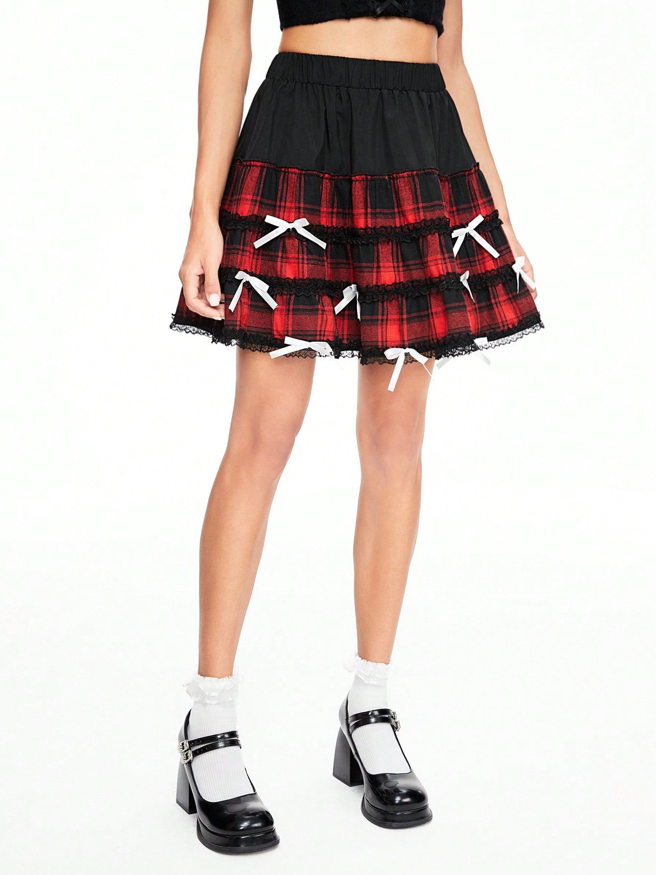 ROMWE Kawaii Minifalda dulce de mujer con diseño a cuadros, encaje de contraste y adorno de lazo, verano