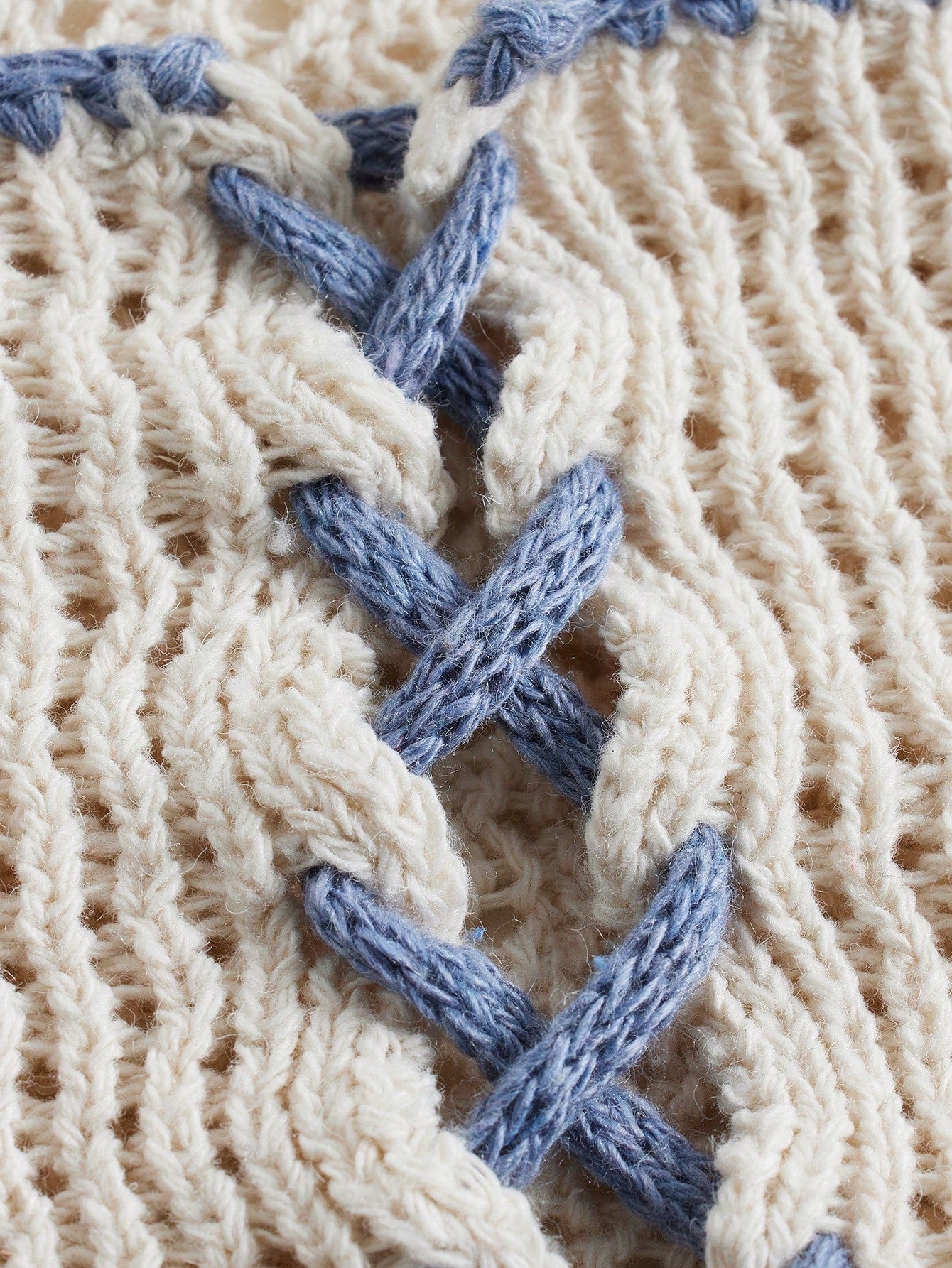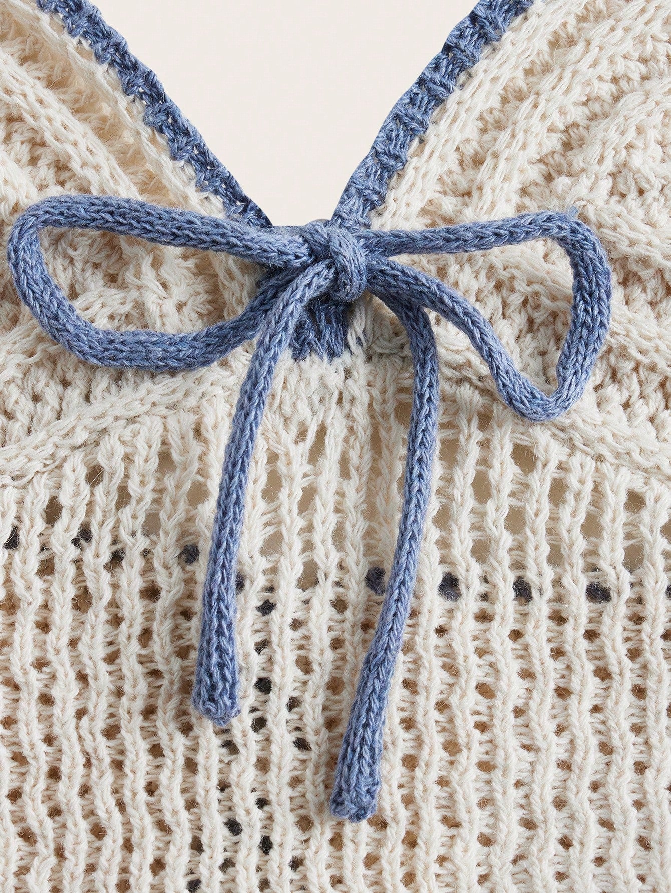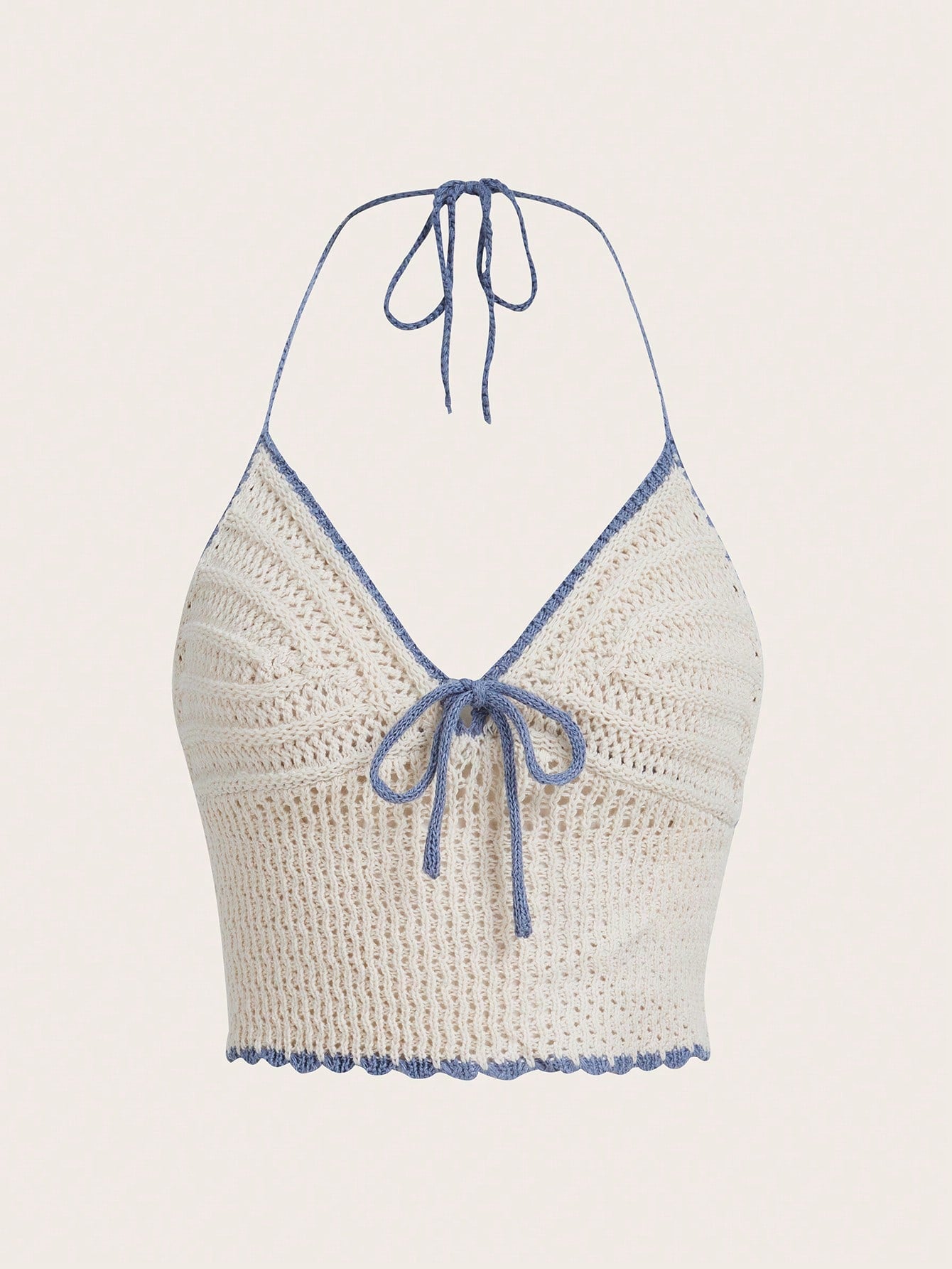 ROMWE Kawaii Parte superior de punto con atadura delantera de encaje a contraste, para vacaciones en la playa, escuela