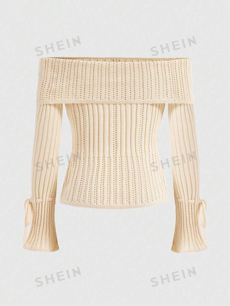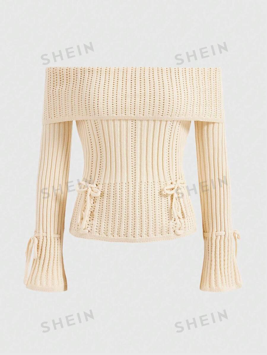 ROMWE Kawaii Sensual suéter crema-blanco de cuello alto con hombros descubiertos y ajustado al Body con cuello vuelto y lazo para mujer
