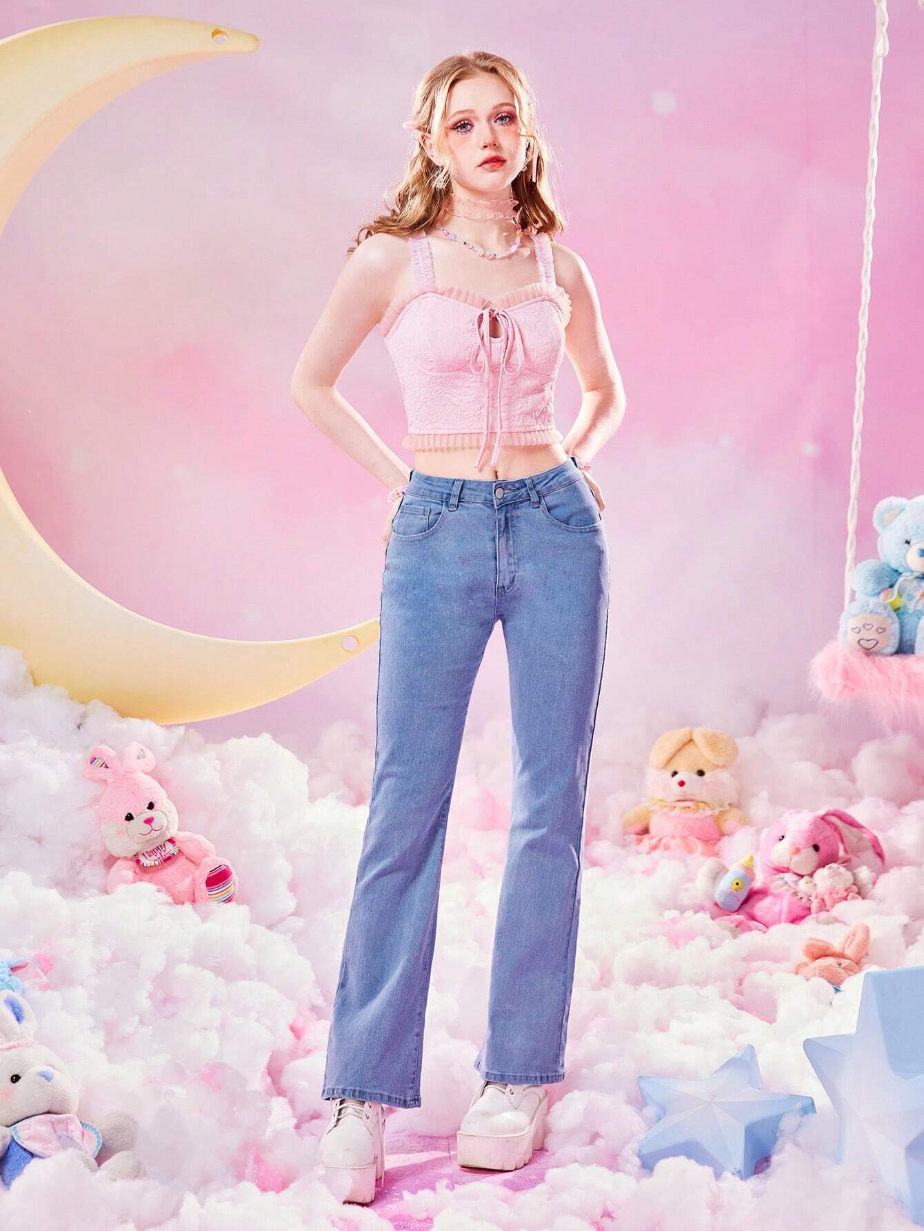 ROMWE Kawaii Top de tirantes con cordón delantero ribete fruncido mujer