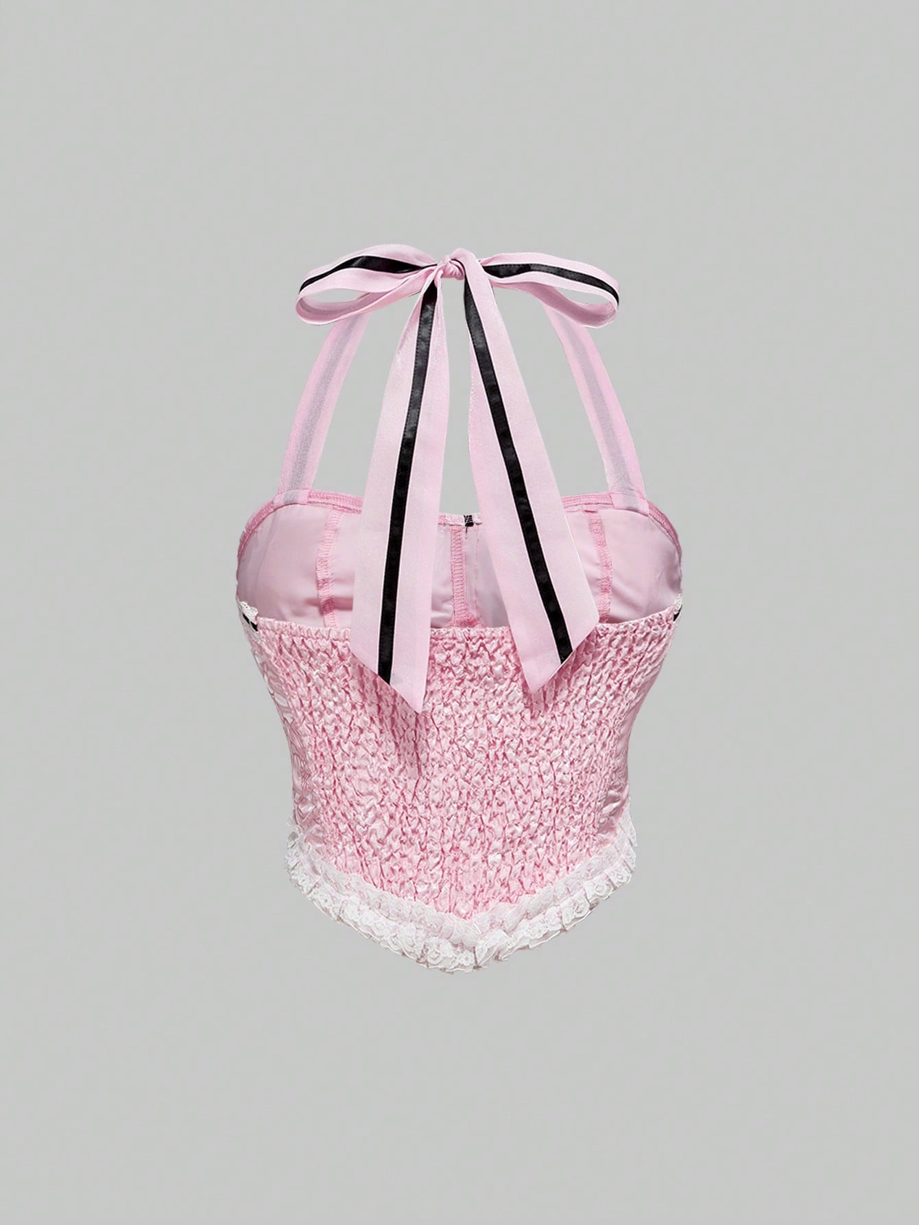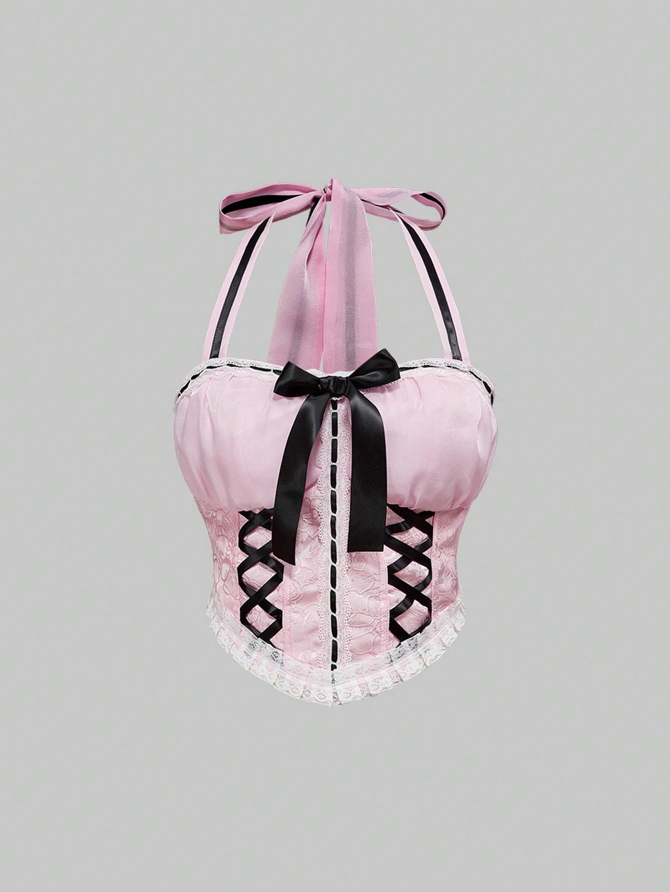 ROMWE Kawaii Top sin espalda con cuello de halter, bloqueo de color y lazo en la espalda, estilo palaciego, color rosa