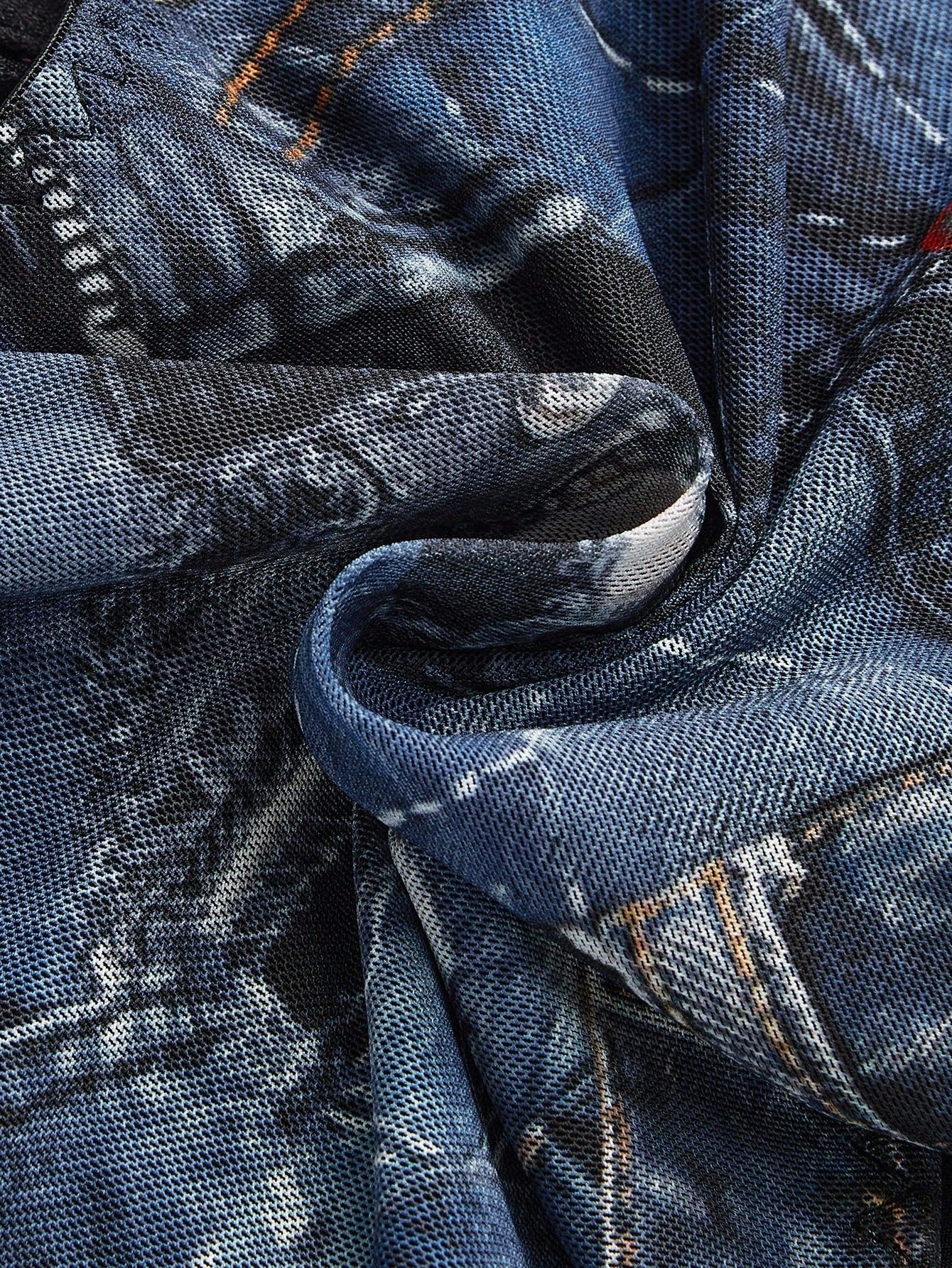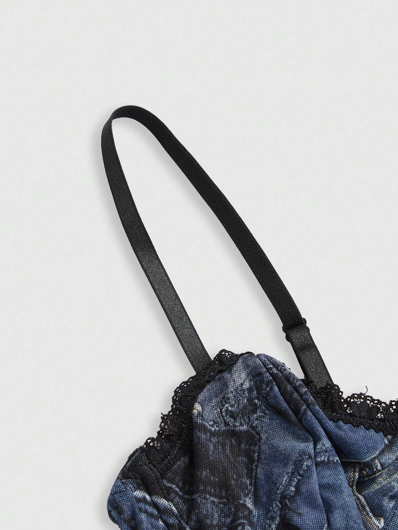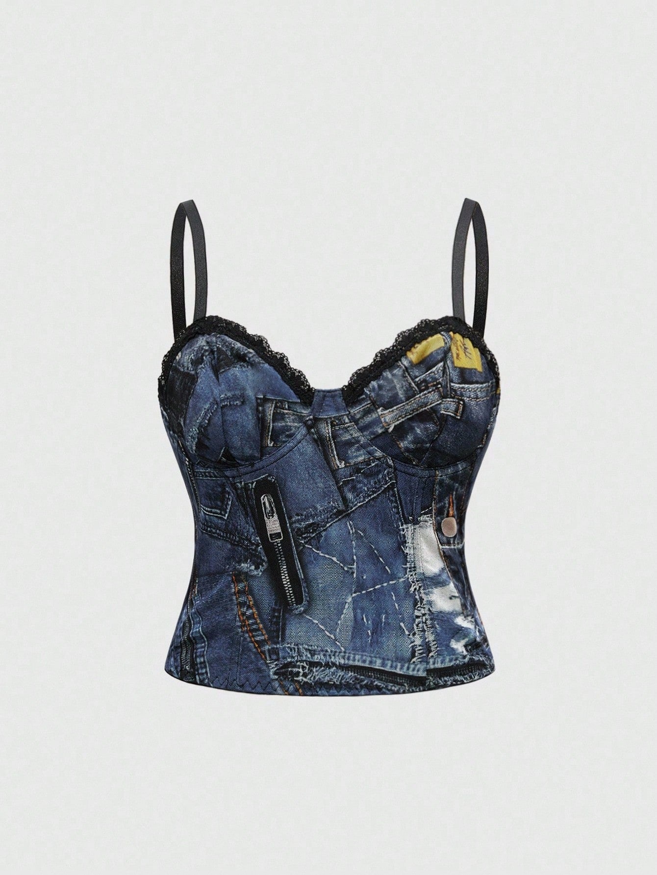ROMWE Top de tirantes de mujer con efecto de tela vaquera vintage, con parches de encaje y cremallera de malla