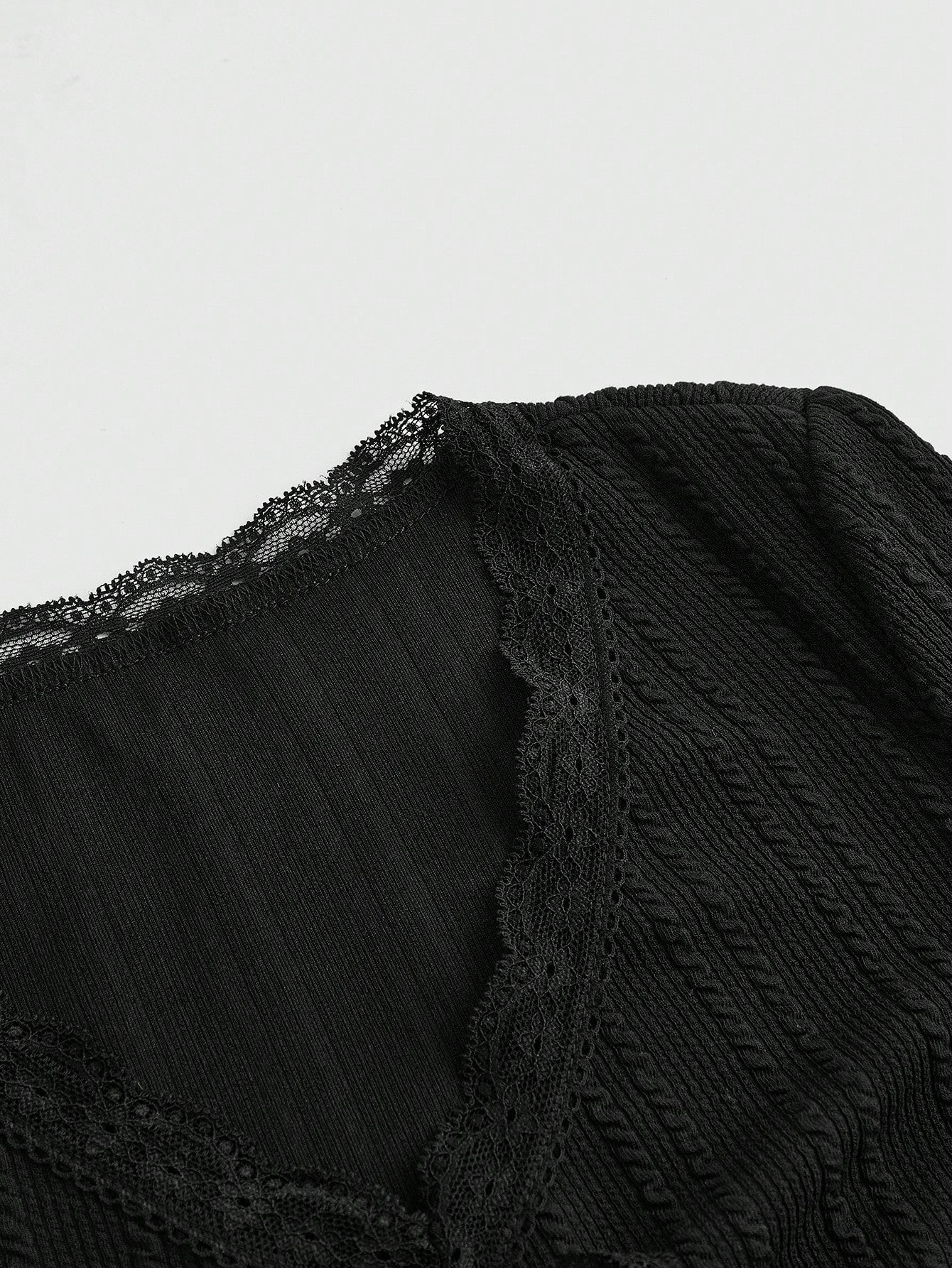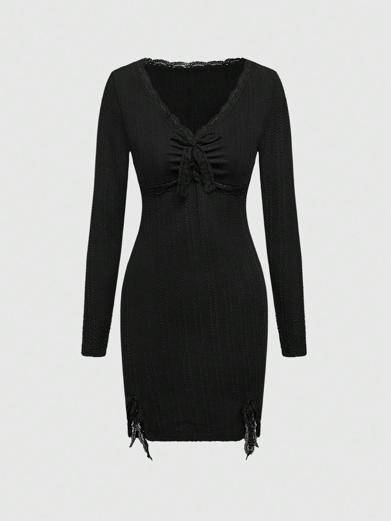 ROMWE Vestido corto con abertura lateral, contraste de textura, encaje y lazo en la cintura