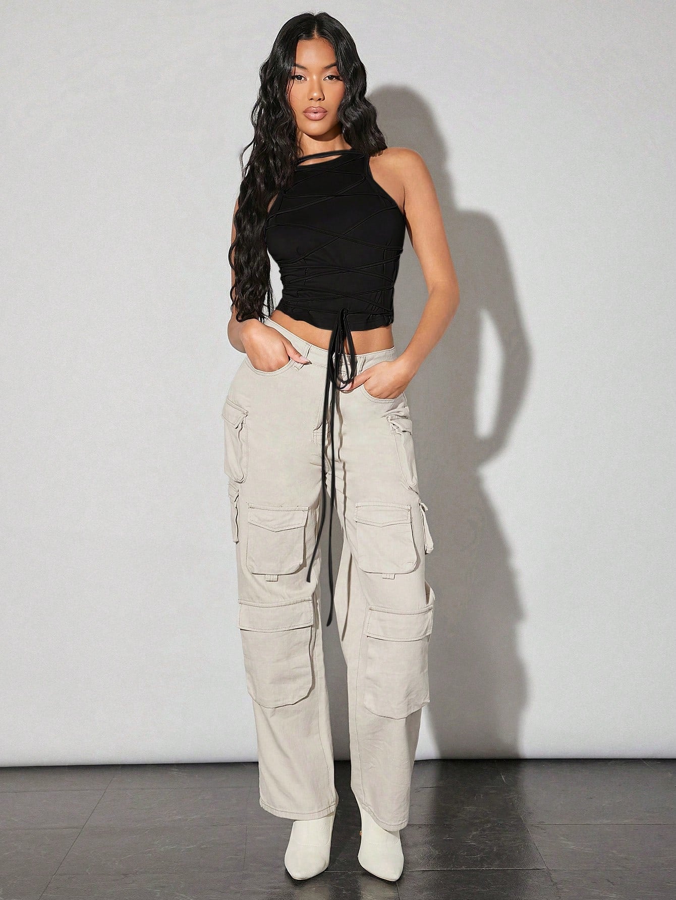 SHEIN BAE Blusa De Tirantes Ajustada Con Encaje Y Cordones De Color Sólido Para Mujer