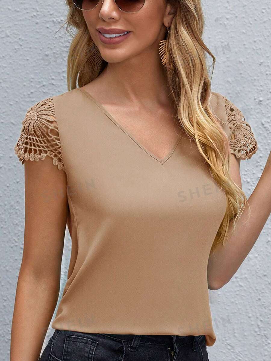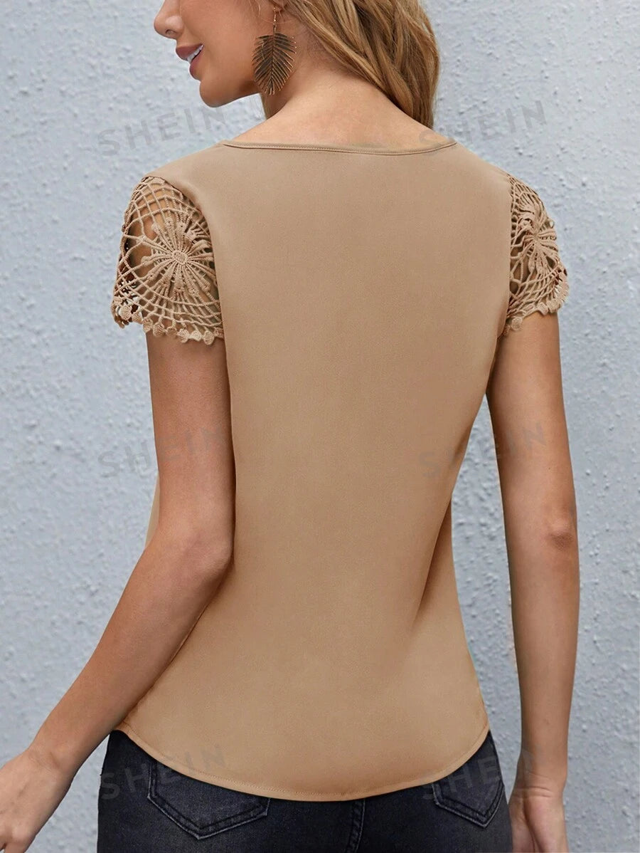 SHEIN Clasi Camisa tejida informal para mujer con parche de encaje y unicolor para el verano