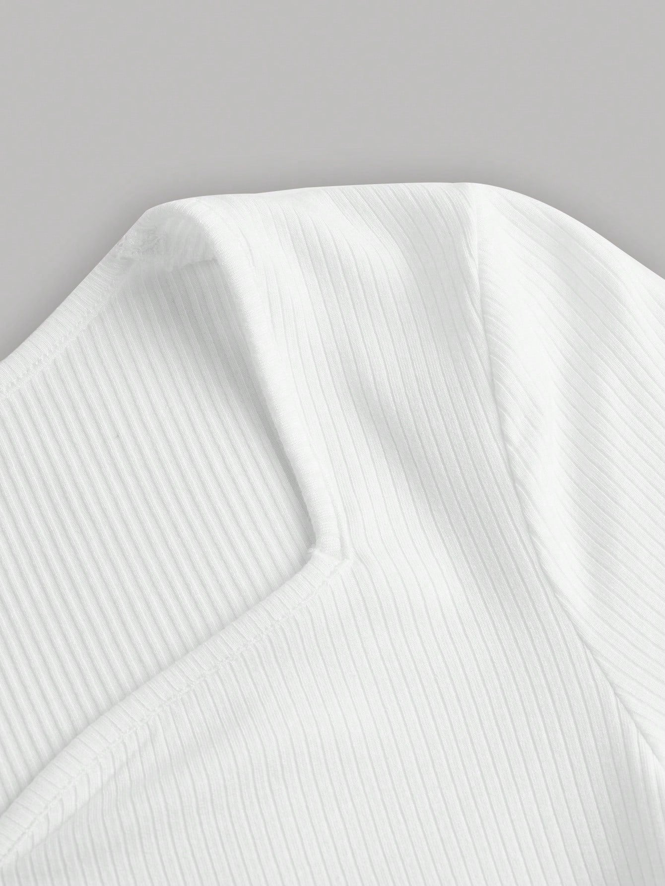 SHEIN El Color Sólido Hecho Punto De Las Muchachas Adolescentes Ahueca Hacia Fuera La Camiseta Rayada Con El Cuello Del Amor, Estilo Casual