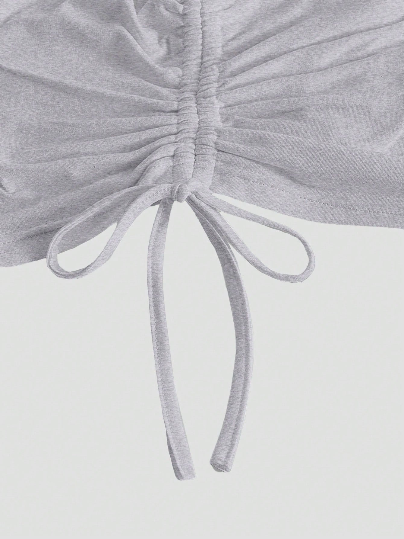 SHEIN EZwear Camiseta ajustada corta con cuello redondo, manga corta, diseño cruzado estampado y cordón lateral para mujer, adecuada para el verano