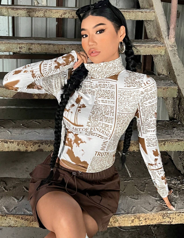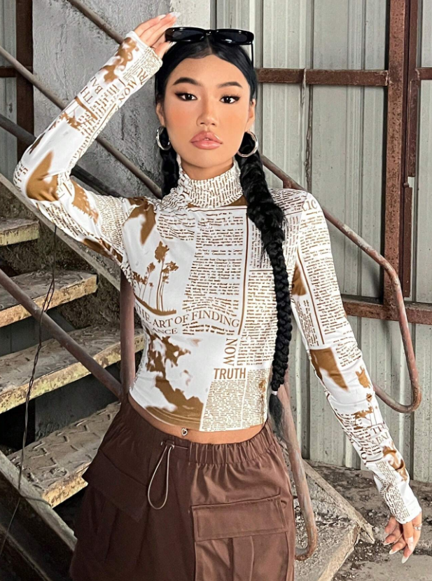 SHEIN EZwear Camiseta crop con estampado de periódico de cuello alto