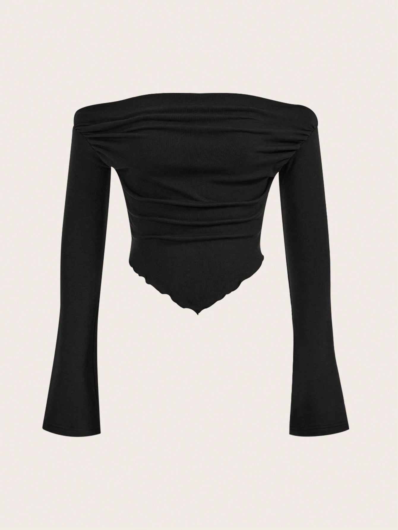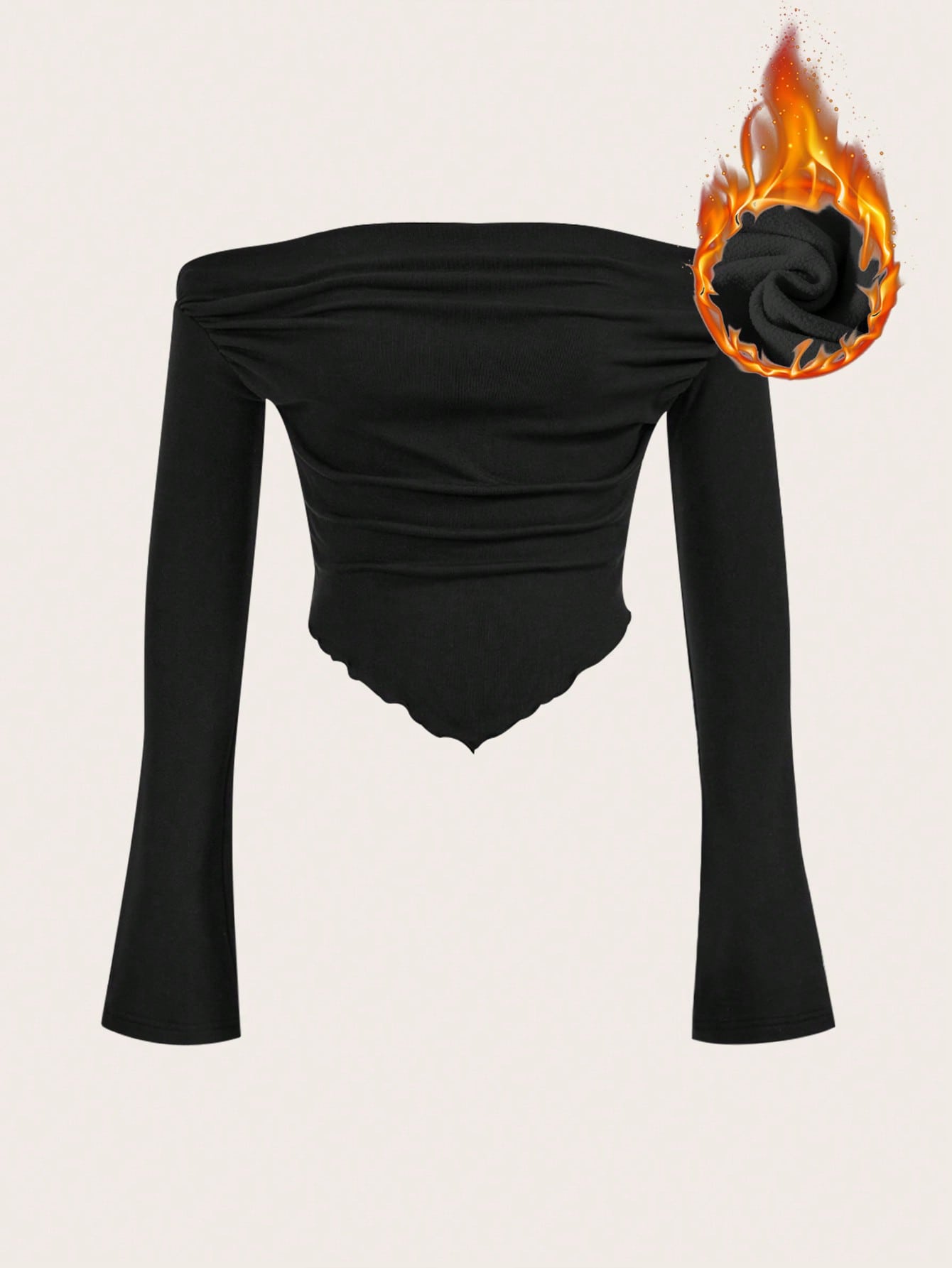 SHEIN EZwear Camiseta de manga larga de ajuste ceñido con hombros caídos, fruncido, bajo asimétrico, forro polar, una camiseta interior versátil