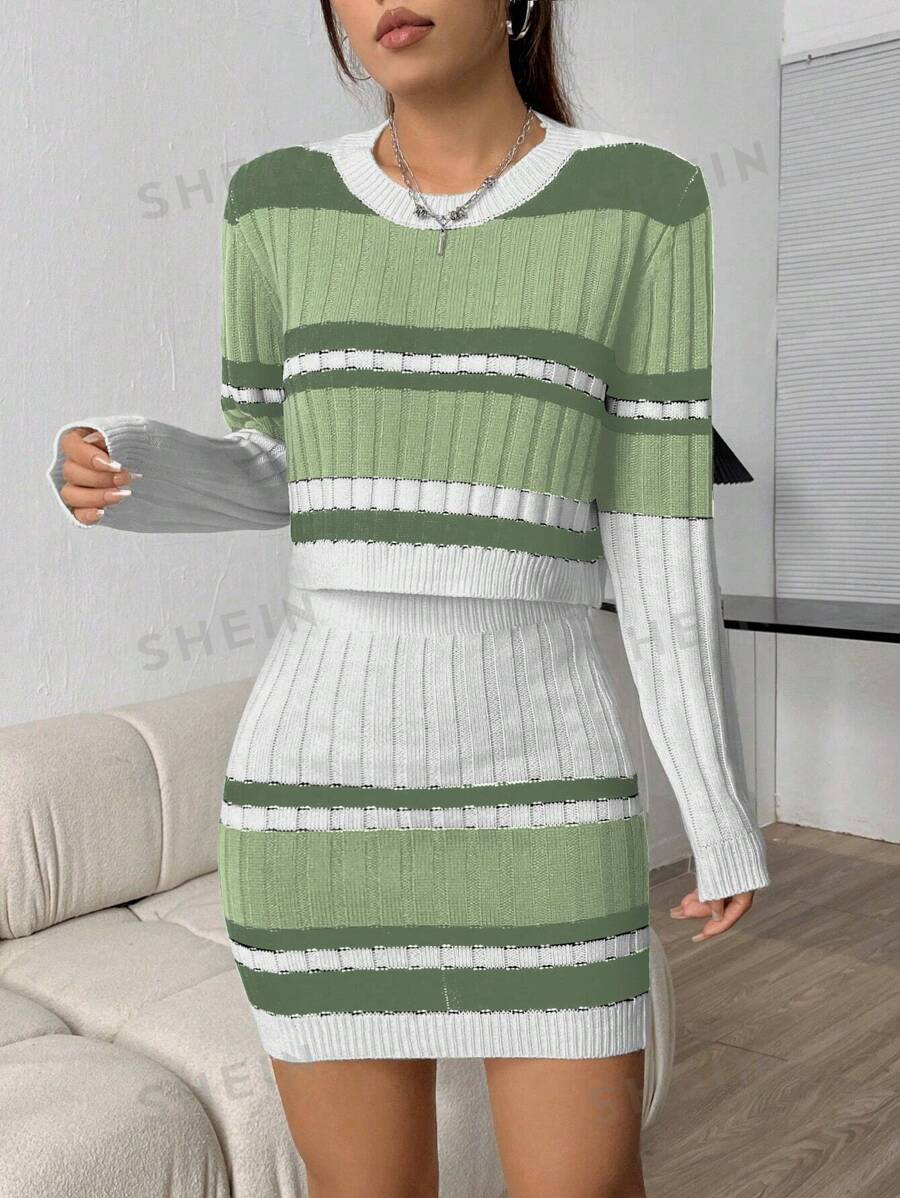 SHEIN EZwear Conjunto De Dos Piezas De Suéter Con Cuello Redondo A Rayas Y Falda De Punto Para Mujer