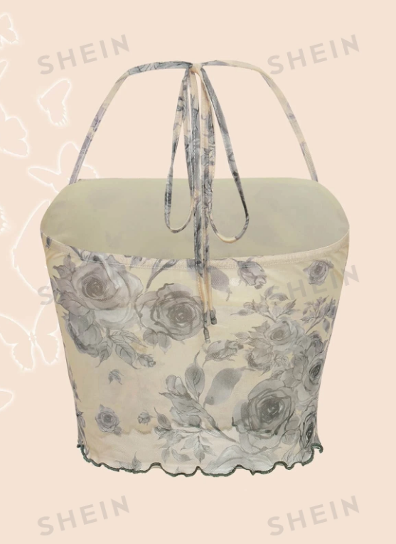 SHEIN ICON Top halter con estampado floral ribete en forma de lechuga de espalda abierta con cordón