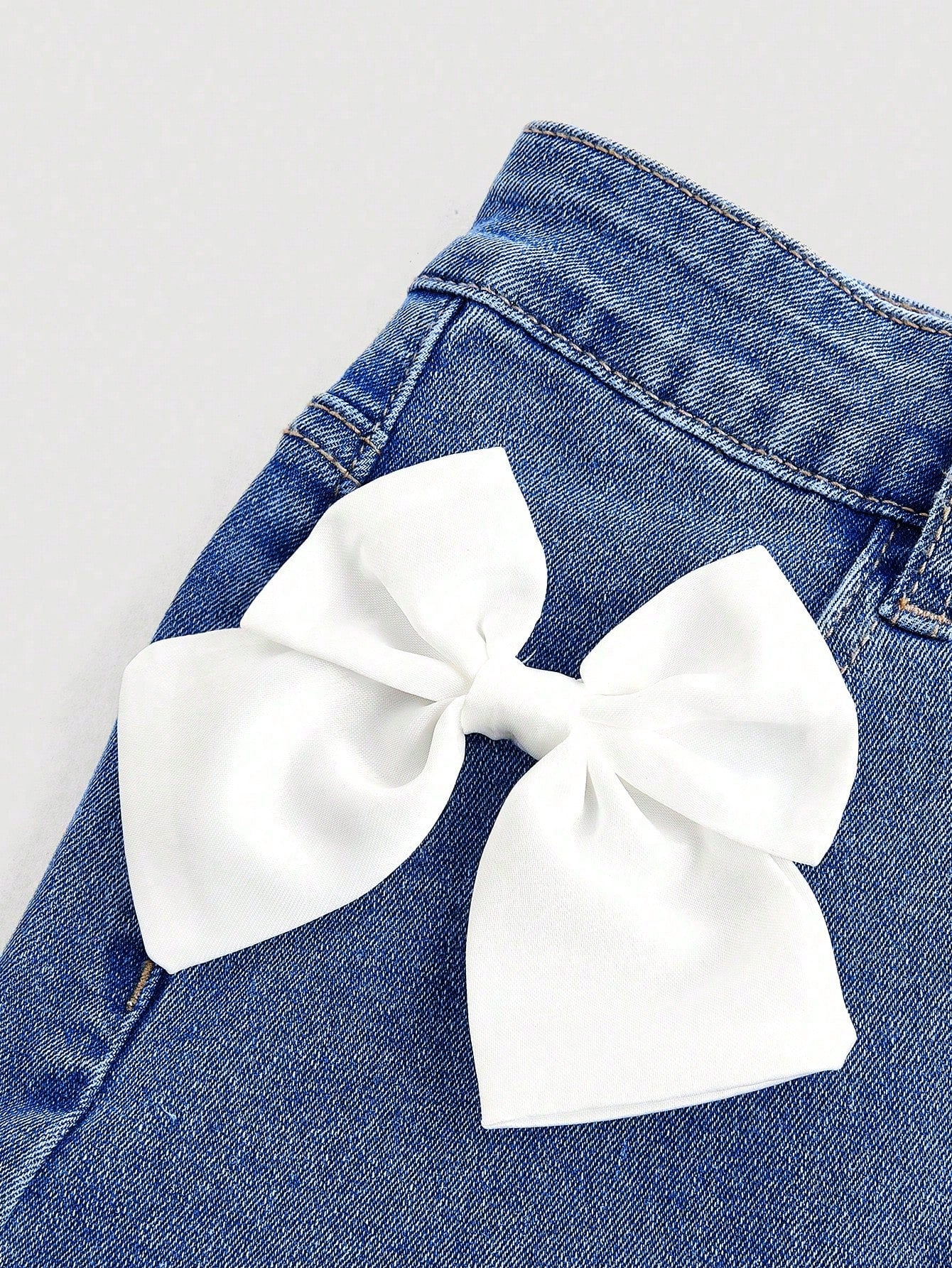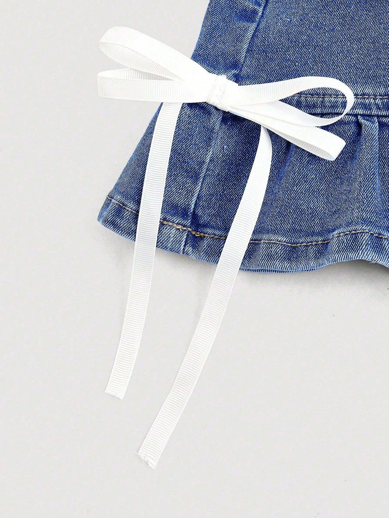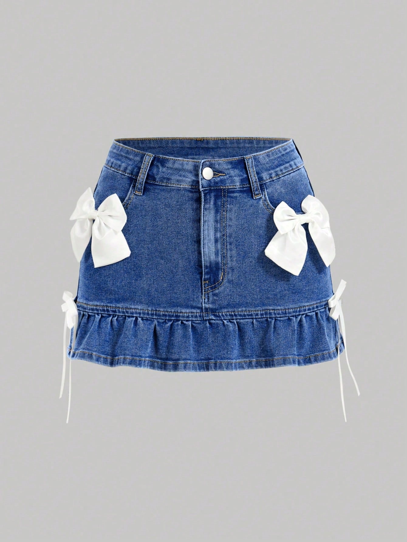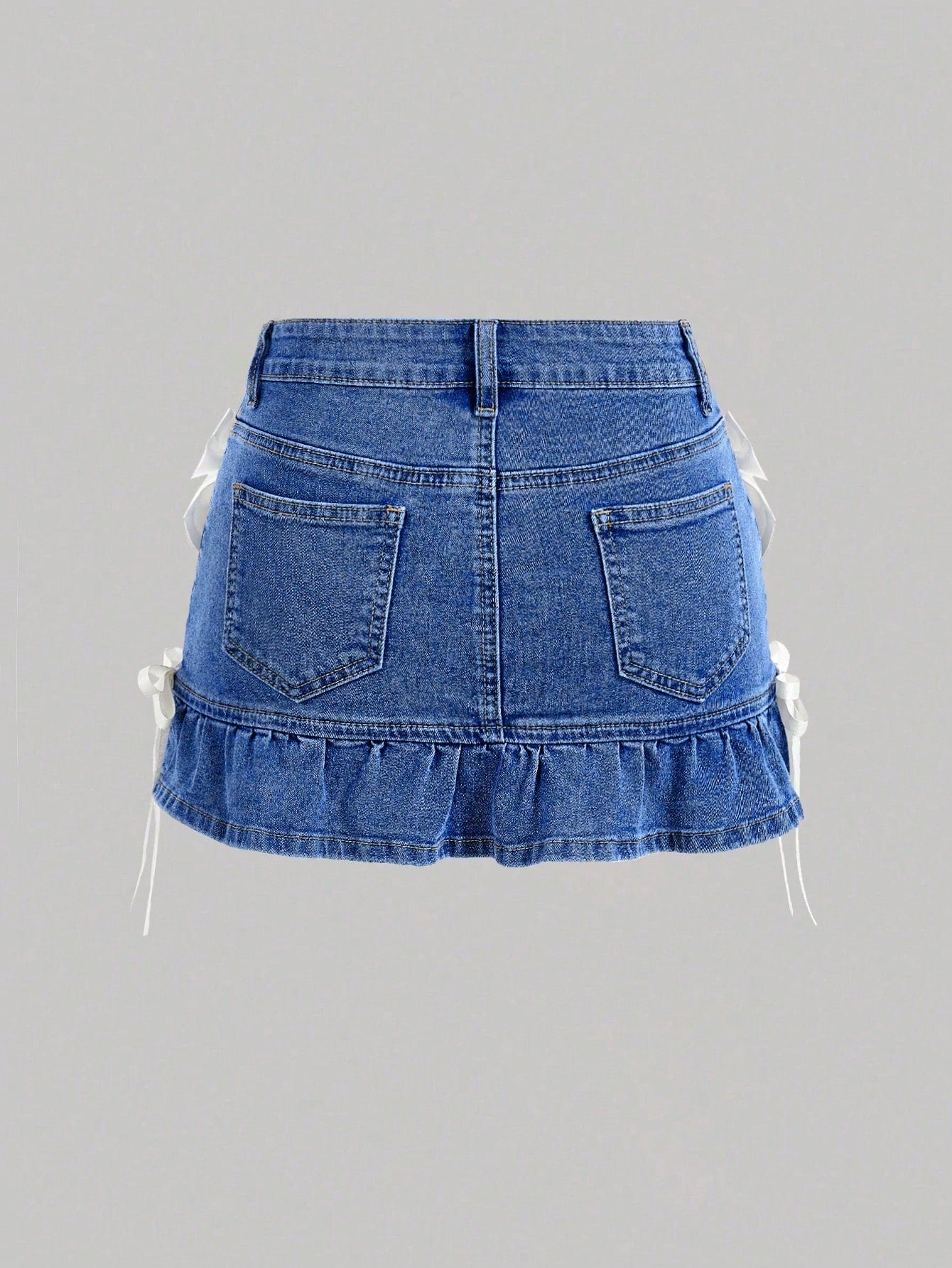 SHEIN MOD Falda vaquera de mujer con decoración de lazo, color de contraste, dobladillo con volantes y bolsillos