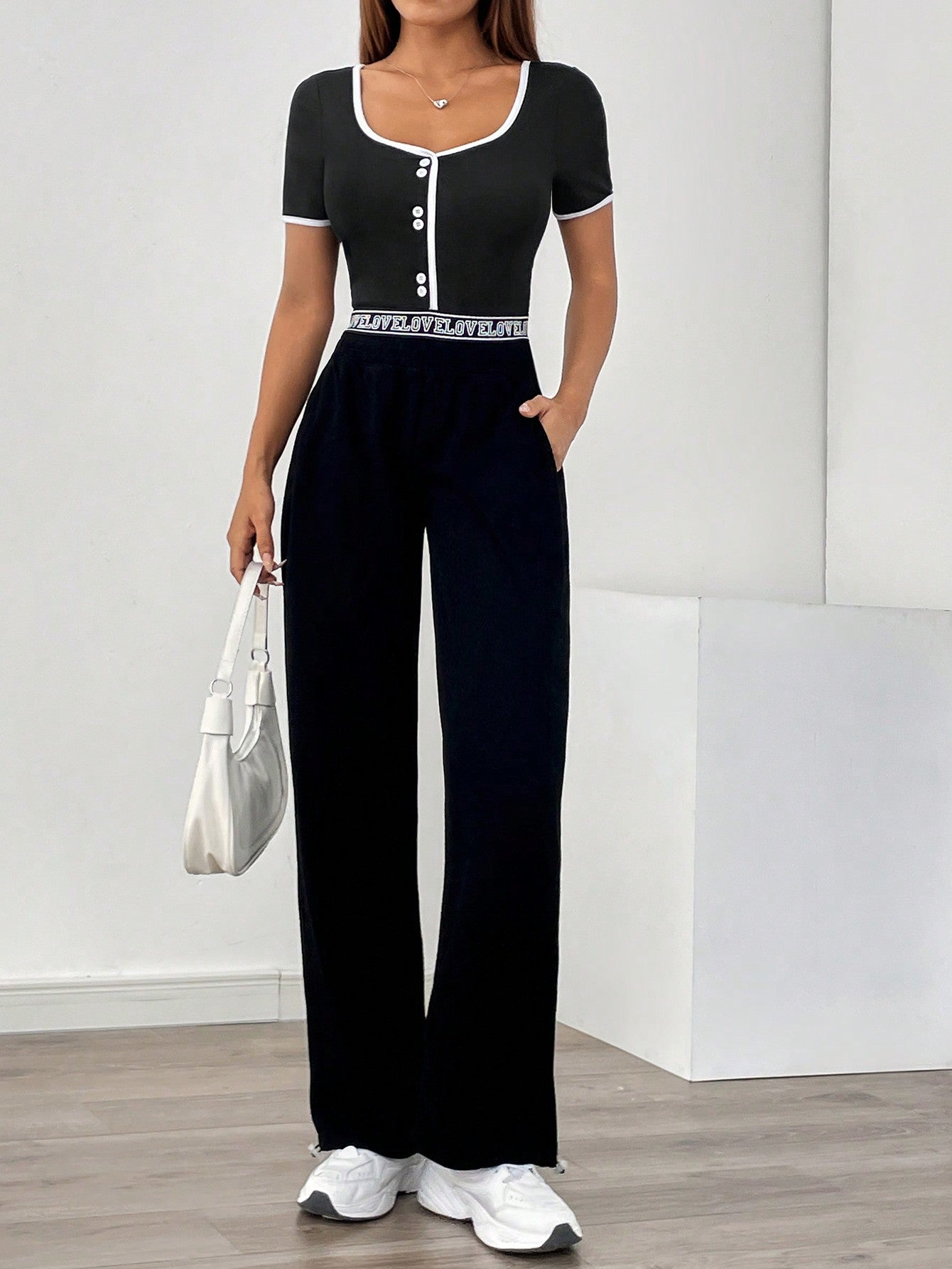 SHEIN Mulvari Camiseta de verano de manga corta para mujer con letras y parches, ajuste delgado y cinturón de hebilla de única