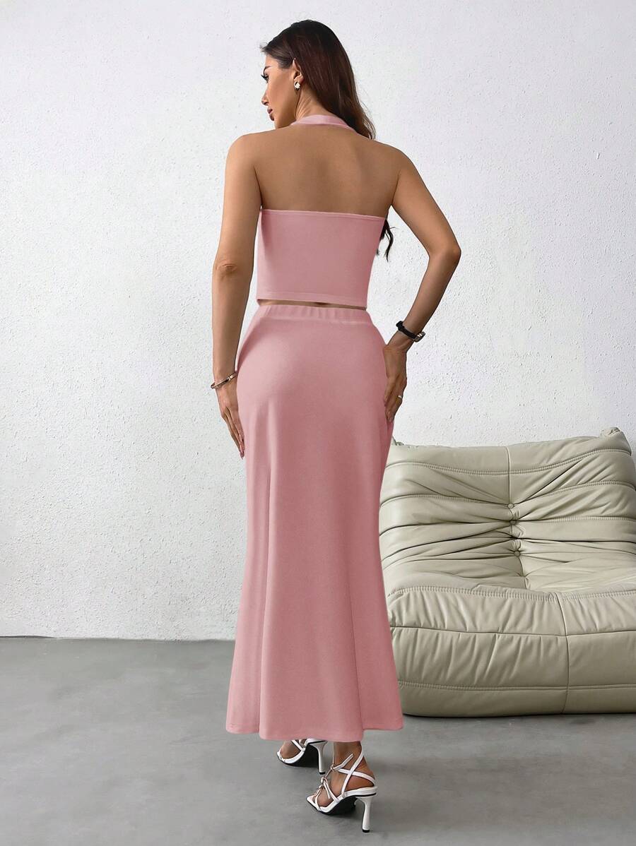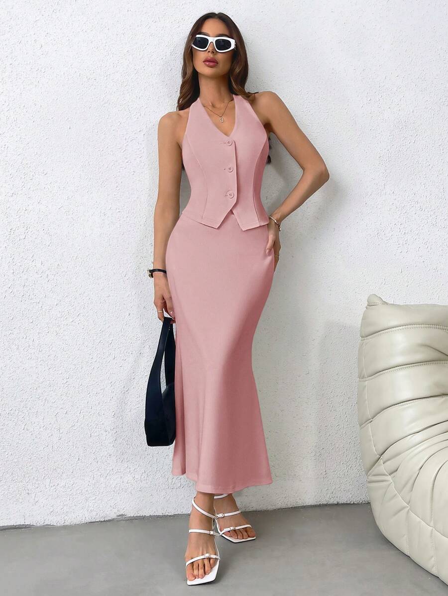 SHEIN Privé Chaqueta en estilo francés para mujeres con diseño sencillo, cuello halter, abierta al frente con botones, y falda larga con cola de pescado. Adecuada para bodas, festivales, citas y vacaciones.