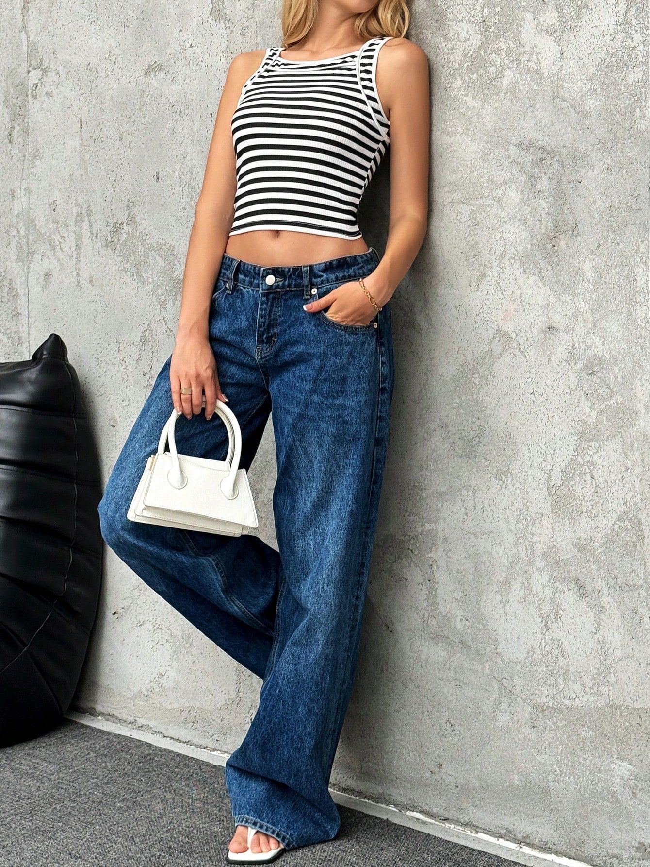 SHEIN Relaxiva Camiseta de tirantes casual de verano estampado de rayas negro y blanco con cuello redondo