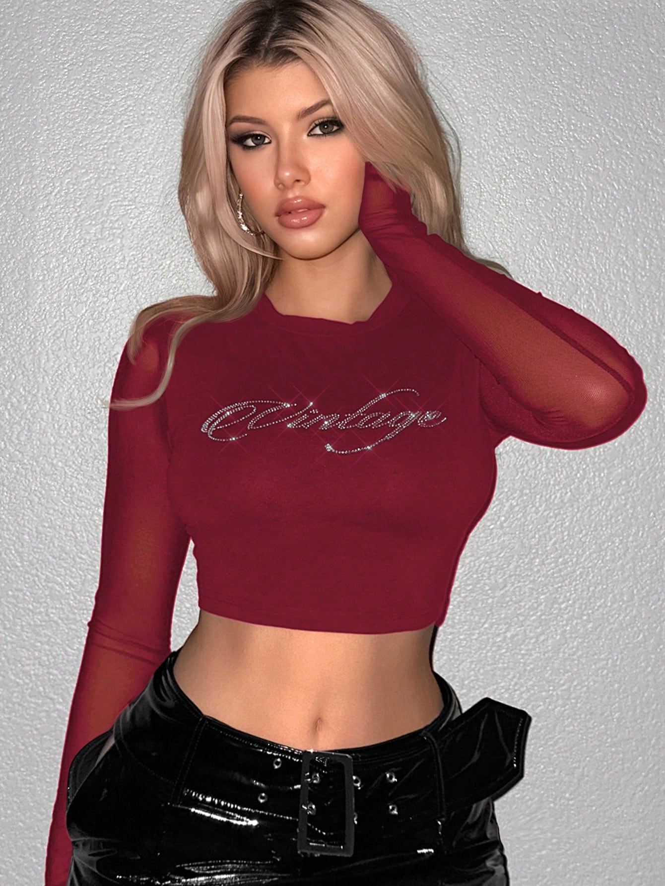 SHEIN Sweetina Blusa corta de malla con contraste y patrón de letras con rhinestones