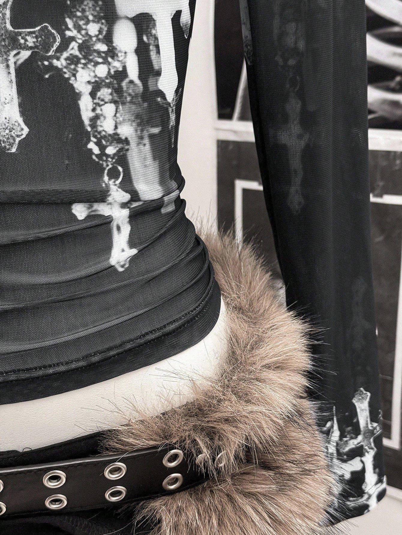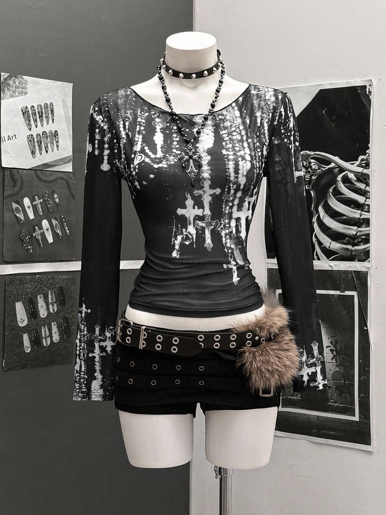 StreetHx Collar de perlas de malla negra para mujer, camiseta de manga larga casual con estilo punk rock y hombros descubiertos/oblicuos del estilo Y2K de los años 2000