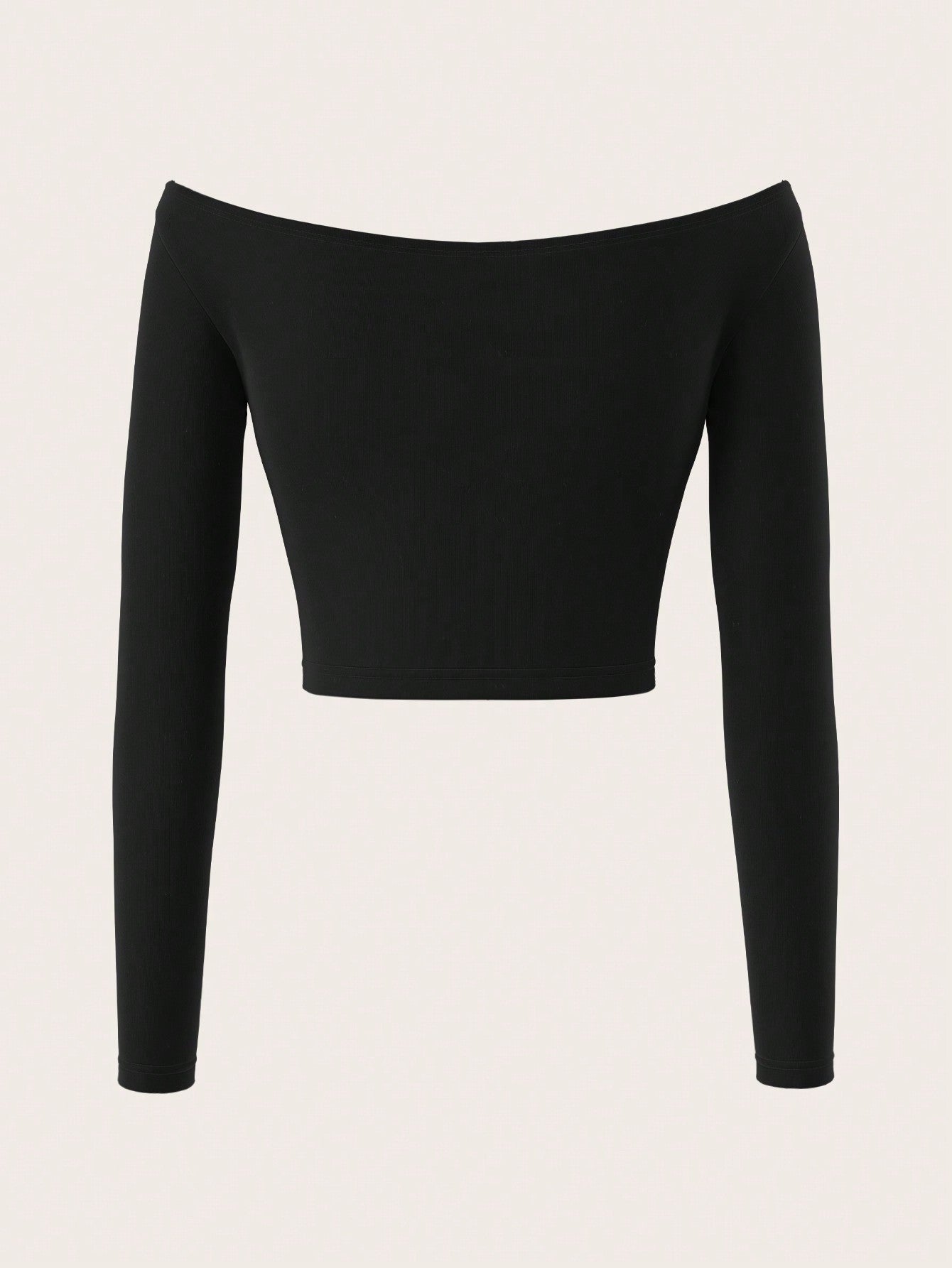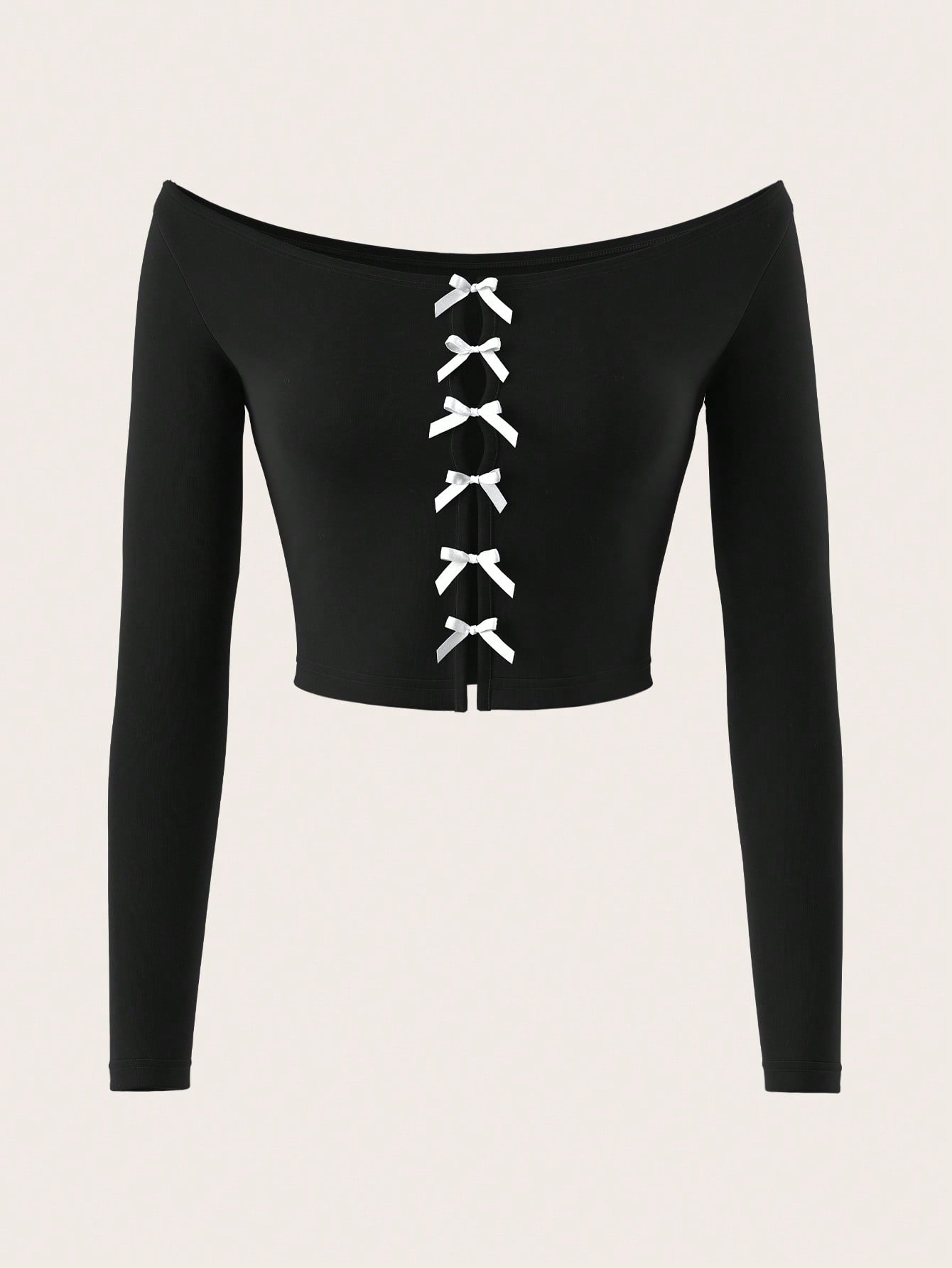 Sweetina Camiseta de manga larga con hombros descubiertos, contraste de color y decoración de moño