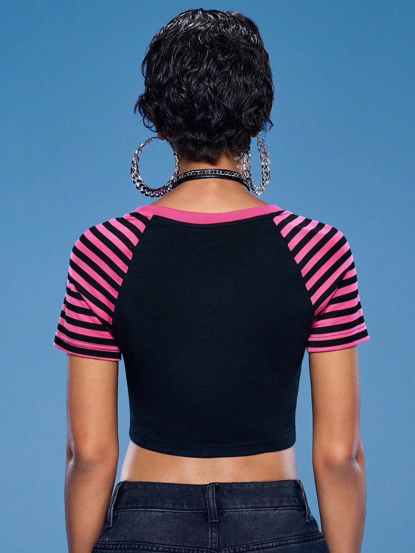 Winx Club X ROMWE Camiseta ajustada con mangas raglán a rayas, estampado de dibujos animados para mujer